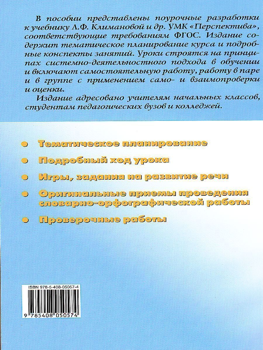 В пособии представлены поурочные разработки по курсу «Русский язык» для 3 класса общеобразовательных учреждений к УМК Л.Ф. Климановой и соавт. образовательной системы «Перспектива», соответствующие требованиям Федерального государственного образовательного стандарта начального общего образования. Пособие содержит тематическое планирование курса и подробные конспекты уроков, обеспечивающие целостное изучение родного языка за счет реализации коммуникативного, познавательного принципов обучения и творческой активности учащихся. Издание адресовано учителям начальных классов общеобразовательных учреждений, студентам педагогических вузов и колледжей, слушателям ИПК. Соответствует ФГОС.Характеристики
