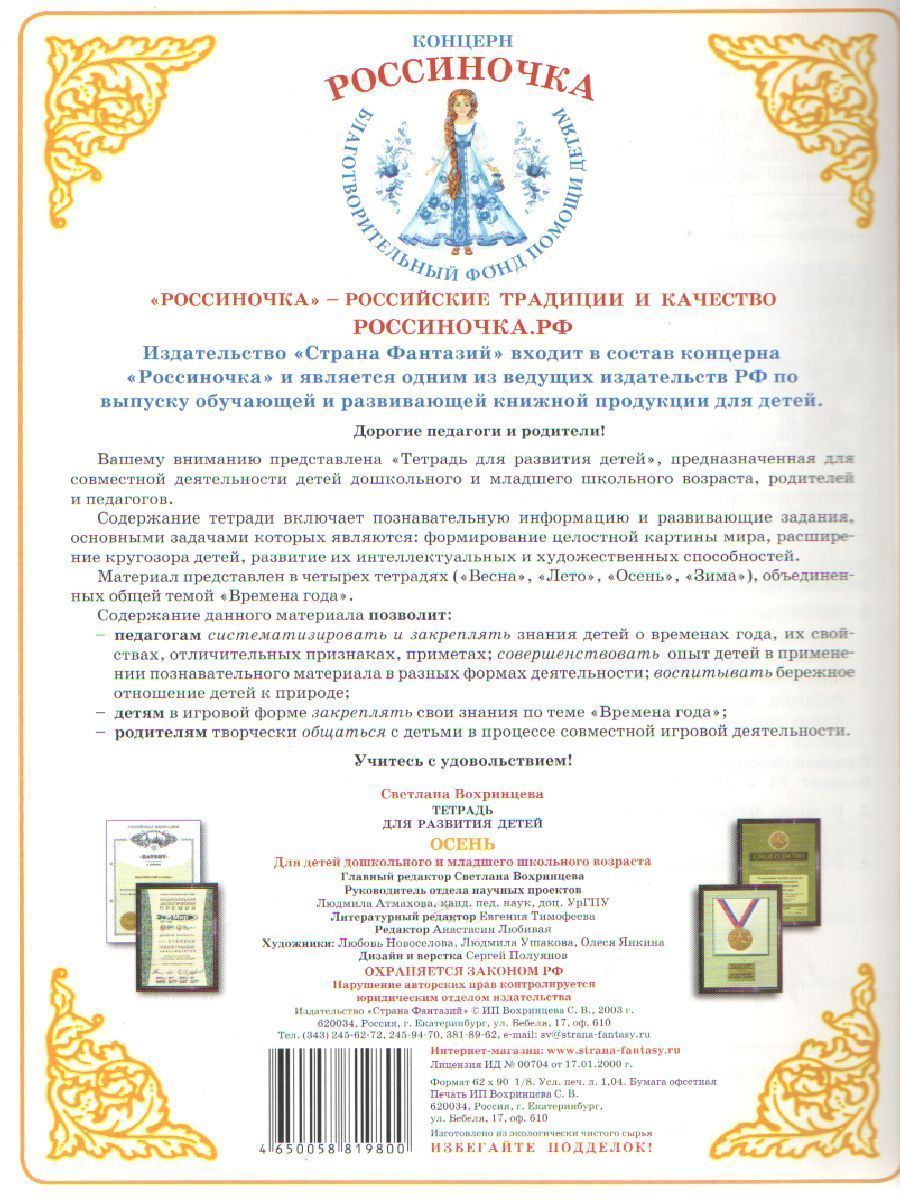 Тетрадь для развития детей «Осень» содержит: высокохудожественные иллюстрации; познавательную информацию; стихи, загадки; викторину; увлекательные игровые и развивающие задания: "Что сначала, что потом", "Что перепутал художник?", "Посмотри, подумай, расскажи"; задания для развития изобразительных навыков: "Соедини линиями точки и раскрась рисунок", "Соедини последовательно точки по цифрам"; задания для изучения английских слов, развития речи и формирования основ математики и грамоты. Дорогие педагоги и родители! «Тетрадь для развития детей» предназначена для совместной деятельности родителей и педагогов с детьми дошкольного и младшего школьного возраста.Характеристики