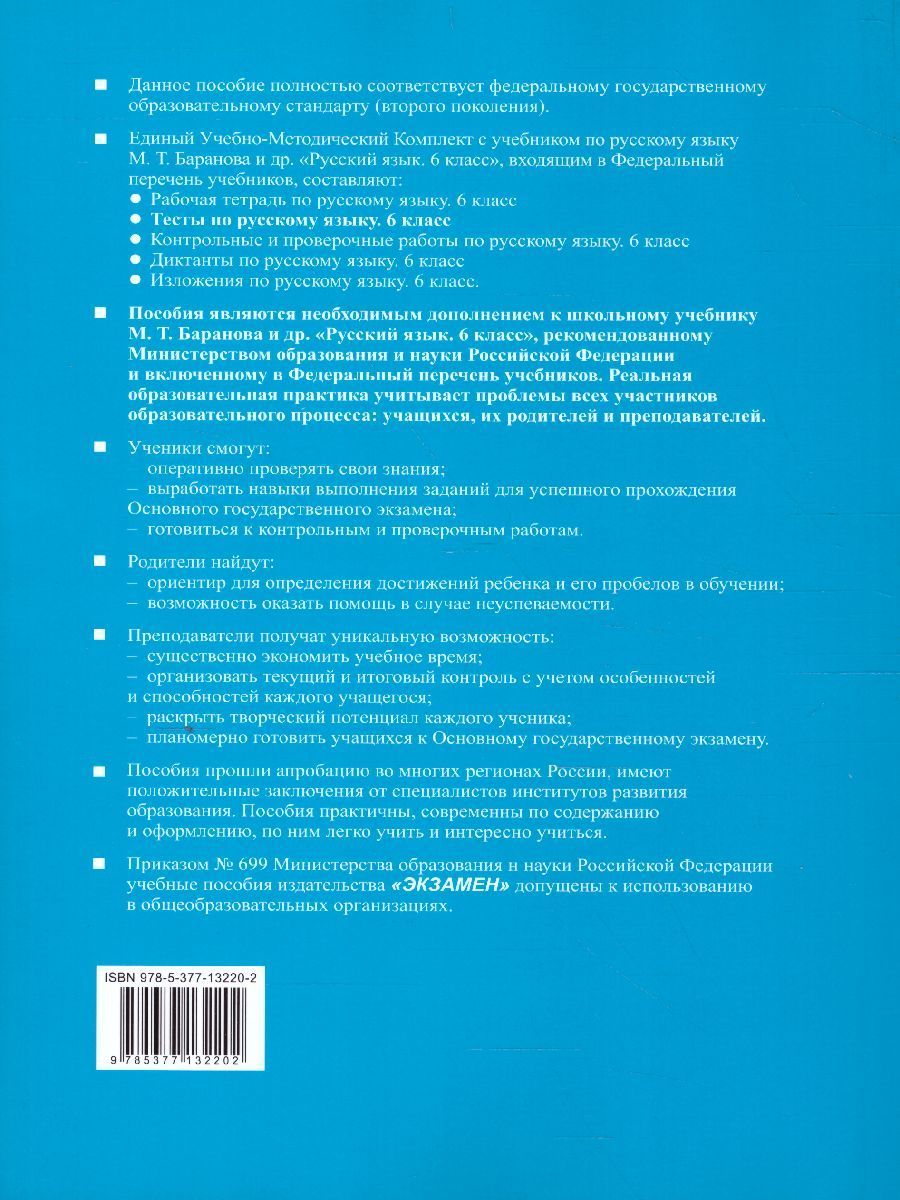 Русския язык 6 класс. Тесты. К учебнику М.Т. Баранова. Часть 2. ФГОС