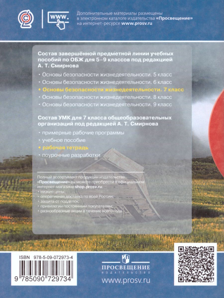 В тетрадь включены творческие увлекательные задания (тесты, ситуативные задачи, кроссворды), рассчитанные на выработку у учащихся способностей самостоятельно искать и находить решения проблем по обеспечению личной безопасности и безопасности окружающих. Структура пособия соответствует учебнику «Основы безопасности жизнедеятельности. 7 класс» (под редакцией А.Т. Смирнова). Пособие входит в УМК "ОБЖ. 5-9 классы" под редакцией А.Т.Смирнова.Характеристики