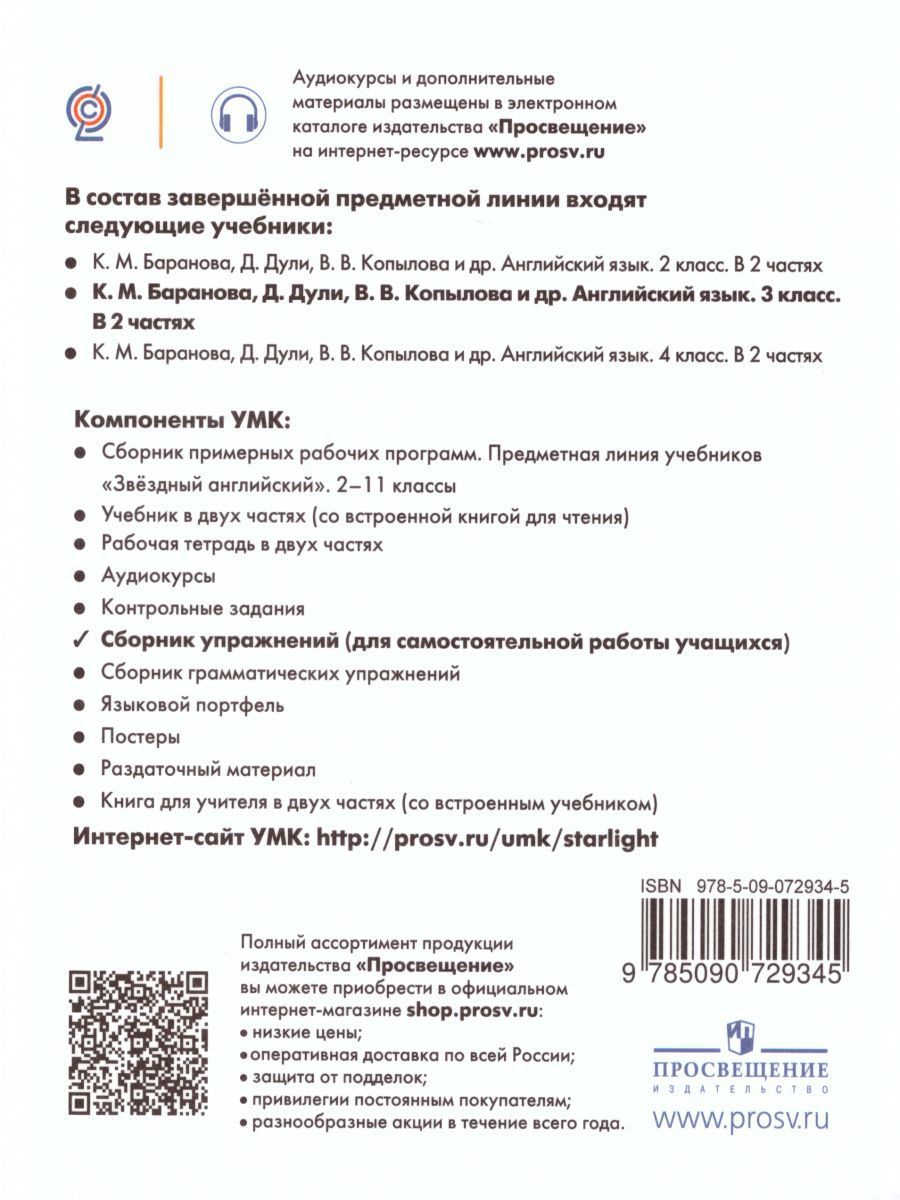Сборник упражнений является дополнительным компонентом УМК серии «Звёздный английский» и предназначен для учащихся 3 класса общеобразовательных учреждений и школ с углублённым изучением английского языка. Сборник содержит разнообразные задания и упражнения к каждому уроку учебника, направленные на развитие навыков письменной речи и повторение изученного лексико-грамматического материала.Характеристики