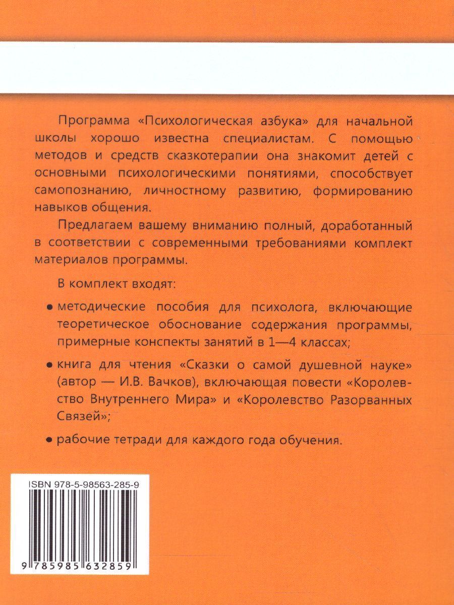 Методическое пособие является частью комплекта материалов к программе «Психологическая азбука», предназначенной для работы в начальной школе (1 - 4). Кроме методического пособия, в комплект входят тетрадь, а также сборник текстов для работы с детьми «Сказки о самой душевной науке». В пособии представлены обоснование программы и сценарии занятий. Главная цель программы - развитие личности ребенка, его самосознания и рефлексивных способностей в тех пределах, которые определяются возрастными возможностями и требованиями психологической безопасности. С помощью программы школьный педагог-психолог может решать задачи психолого-педагогического сопровождения реализации Федерального государственного образовательного стандарта начального общего образования - задачу формирования коммуникативных и личностных универсальных учебных действий. Пособие предназначено для психологов, работающих с учащимися 2-го класса.Характеристики