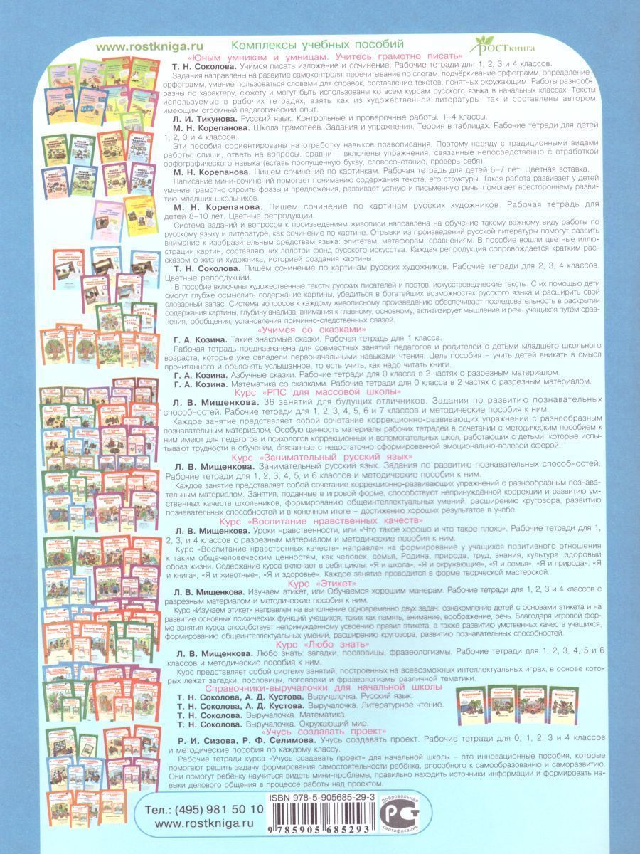 В данном пособии представлены материалы к тематическим коррекционно-развивающим занятиям с третьеклассниками курса "РПС" ("Развитие познавательных способностей"). Каждое занятие представляет собой сочетание коррекционно-развивающих упражнений с разнообразным познавательным материалом. Занятия, поданные в игровой форме, способствуют непринуждённой коррекции и развитию умственных качеств школьников, формированию общеинтеллектуальных умений, расширению кругозора, развитию познавательных способностей и в конечном итоге - достижению хороших результатов в учёбе. Особую ценность материалы рабочих тетрадей в сочетании с методическим пособием к ним имеют для педагогов и психологов коррекционных и вспомогательных школ, работающих с детьми, которые испытывают трудности в обучении, связанные с недостаточно сформированной эмоционально-волевой сферой. Рабочие тетради адресованы учащимся первого класса (детям 8-9 лет) массовых школ. Рабочие тетради и методическое пособие к ним рекомендованы воспитателям групп продлённого дХарактеристики