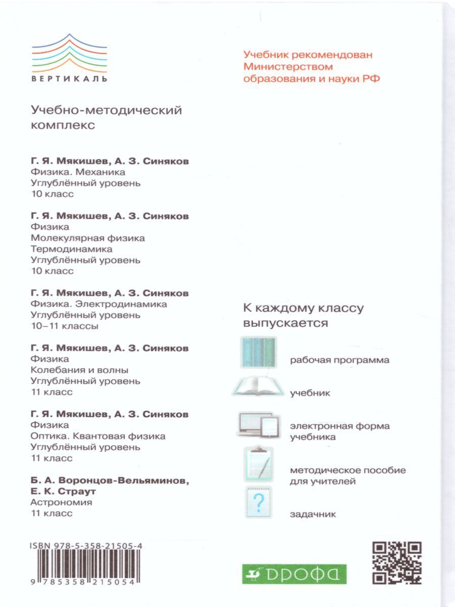 Учебник полностью соответствует требованиям Федерального государственного образовательного стандарта, рекомендован Министерством образования и науки Российской Федерации. Включен в Федеральный перечень учебников в составе завершенной предметной линии. В учебнике на современном уровне изложены фундаментальные вопросы школьной программы, представлены основные применения законов физики, рассмотрены методы решения задач. Книга адресована учащимся физико-математических классов и школ, слушателям и преподавателям подготовительных отделений вузов, а также читателям, занимающимся самообразованием и готовящимся к поступлению в вуз.Характеристики
