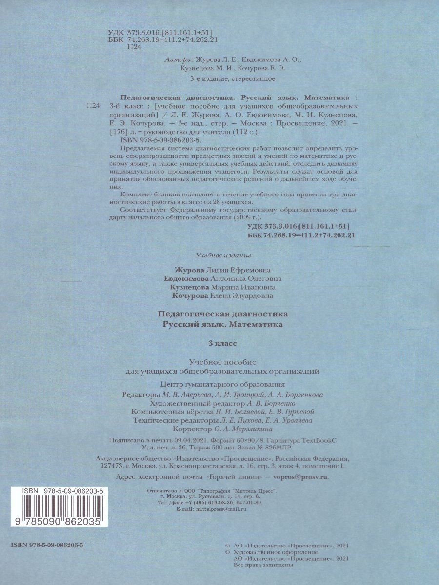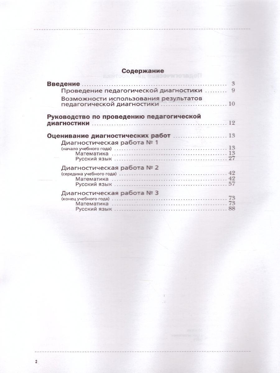 Диагностические работы позволяют зафиксировать уровень достижений, а также динамику индивидуального продвижения учащегося. Результаты служат основой для принятия обоснованных педагогических решений о дальнейшем ходе обучения. Предлагаемая система диагностических работ позволит определить уровень сформированности предметных знаний и умений по математике и русскому языку, а также универсальных учебных действий; отследить динамику индивидуального продвижения учащегося.Характеристики