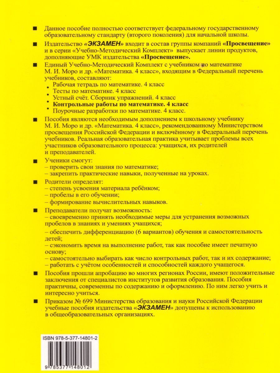 Данное пособие полностью соответствует федеральному государственному образовательному стандарту (второго поколения) для начальной школы. Пособие представляет собой сборник текущих и итоговых контрольных работ по математике к учебнику М. И. Моро и др. "Математика. 4 класс". Каждая контрольная работа дана в 6 вариантах. Пособие адресовано учителям и учащимся массовых школ, гимназий, а также классов с углублённым изучением математики.Характеристики