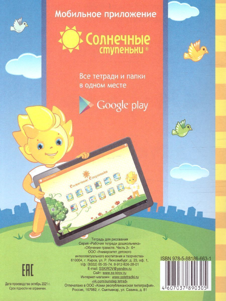 Уважаемые родители и педагоги! .Предлагаем вашему вниманию серию тетрадок для дошкольного образования "Солнечные ступеньки". Перед вами тетрадь по обучению грамоте детей старшего дошкольного возраста. Занимаясь по тетрадке, дети смогут познакомиться с гласными и согласными буквами, научатся их писать. А также составлять и читать слоги. Выполняя задания, ребенок развивает координацию движений рук и пальцев, совершенствуя речевое развитие, внимание, память, мышление. .Игровая форма работы позволяет вашему малышу с удовольствием заниматься по этой тетрадке. Все задания соответствуют задачам умственного развития и воспитания, определенным "Типовой программой воспитания и обучения в детском саду". Данная методика используется на протяжении 10 лет. .Для детей 5-6 лет.Характеристики