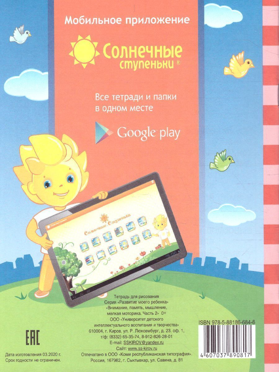 Перед вами тетрадь с проверочными заданиями, при помощи которых вы сможете оценить уровень развития вашего ребенка, определить, соответствует ли он возрастным нормам. В тетради вы найдете четыре раздела: "Внимание", "Память", "Мелкая моторика", "Мышление". Использовать тетрадь можно как при индивидуальной, так и при групповой работе с детьми. Бумага офсетная.Характеристики