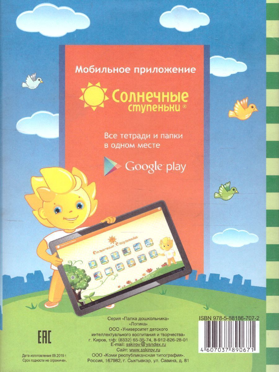 Вашему вниманию предлагается серия папок для дошкольного образования "Солнечные ступеньки". "Солнечные ступеньки" предназначены для всестороннего развития способностей ребенка. Все задания соответствуют задачам умственного развития и воспитания, определенным "Типовой программой обучения и воспитания в детском саду". Тысячи детишек, обучаясь по данным папкам, смогли успешно поступить в самые престижные школы и лицеи. В папке: 16 листов с заданиями и нераскрашенными картинками + 2 цветных вкладыша, которые необходимо разрезать по пунктирным линиям. В папку включены задания по разделам: обобщение, классификация; сравнение; аналогии; систематизация; смысловое соотнесение; отрицание; анализ, синтез; умозаключения; логические задачи. Для детей 4-5 лет.Характеристики