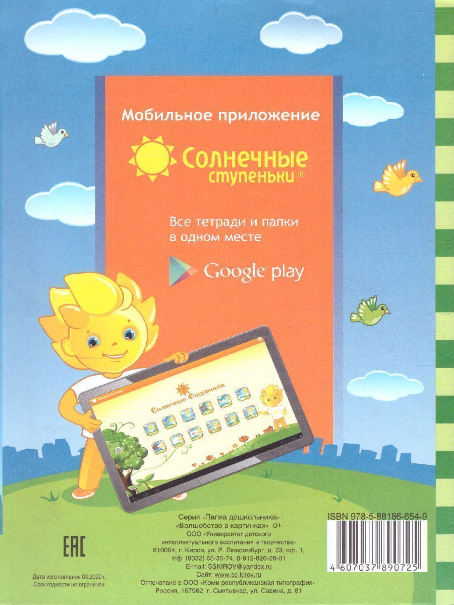 Вашему вниманию предлагается серия папок для дошкольного образования "Солнечные ступеньки". "Солнечные ступеньки" предназначены для всестороннего развития способностей ребенка. Все задания соответствуют задачам умственного развития и воспитания, определенным "Типовой программой обучения и воспитания в детском саду". Тысячи детишек, обучаясь по данным папкам, смогли успешно поступить в самые престижные школы и лицеи. .В папке: 16 листов с заданиями и нераскрашенными картинками + 2 цветных вкладыша, которые необходимо разрезать по пунктирным линиям. .На каждой страничке папки дети смогут раскрасить картинки в соответствии со значками.Характеристики