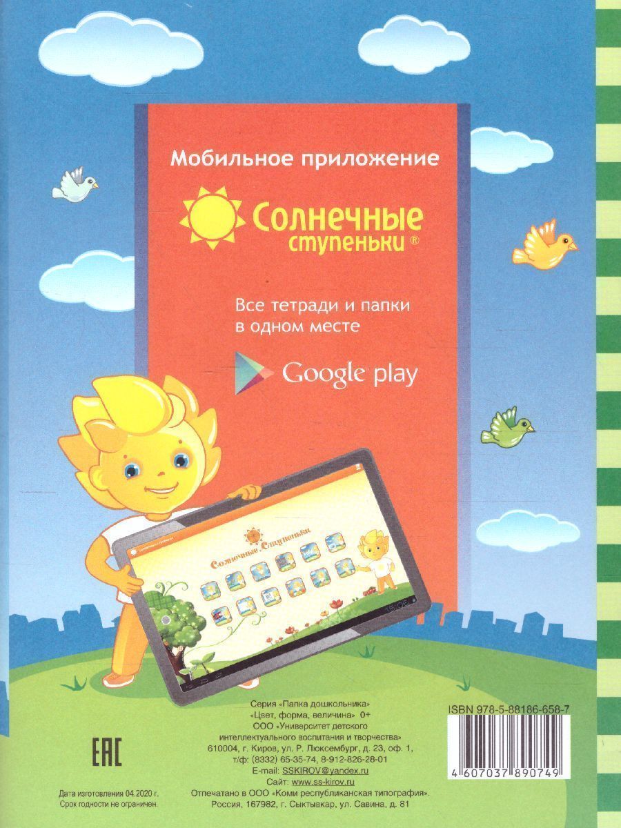 Предлагаем вашему вниманию серию папок для дошкольного образования "Солнечные ступеньки". ."Солнечные ступеньки" предназначены для всестороннего развития способностей ребенка. Все задания соответствуют задачам умственного развития и воспитания, определенным "Типовой программой воспитания и обучения в детском саду". .Папка дошкольника поможет ребенку: .- закрепить знания о форме, величине и цвете предметов; .- развить зрительное восприятие, память, мышление. .На каждой страничке вы найдете различные задания. .Разрежьте вкладыши по пунктирным линиям, у вас получится 40 карточек, при помощи которых вы сможете предложить ребенку различные задания.Характеристики