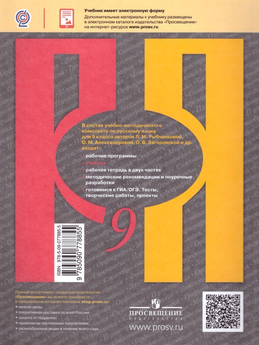 Учебник является частью учебно-методических комплектов линии Л. М. Рыбченковой по русскому языку для основной общеобразовательной школы. Он создан в соответствии с Федеральным государственным образовательным стандартом основного общего образования. Особенностью учебника является направленность обучения на взаимосвязанное овладение языковой, коммуникативной и информационной компетенциями. В переработанном учебнике добавлены новые темы, понятия, термины, определения; введены новые рубрики ("Культура речи", "Лингвистические заметки"); добавлены упражнения разного уровня сложности, проектно-исследовательские задания, усилена работа с текстом; доступно для бесплатного скачивания аудиоприложение к учебнику со звучащими текстами. При таком подходе каждый урок русского языка становится не только уроком овладения знаниями о системе языка, языковыми умениями и навыками, но и уроком развития речи учащихся, уроком формирования метапредметных умений и способов деятельности. Текст размещён на полноцветных страницах, дидактические советы и дополнительные материалы на полях заинтересуют учеников и активизируют работу в классе. Отличительной чертой учебника является формирование функциональной грамотности, подбор текстов из классической и современной литературы в соответствии с возрастными особенностями обучающихся.Характеристики