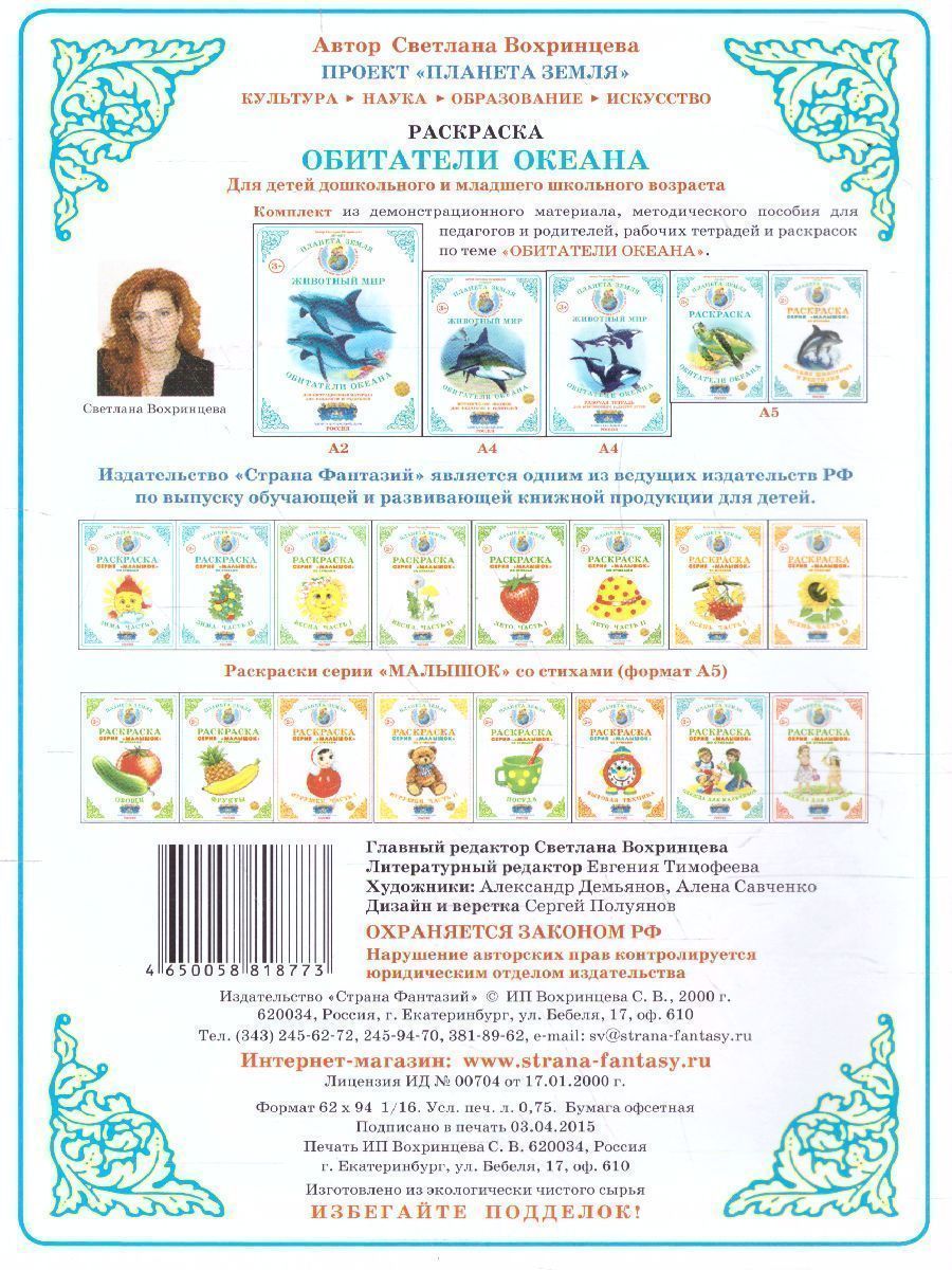 Книжка-раскраска содержит яркие иллюстрации на тему «Обитатели океана». Контуры картинок для раскрашивания чёткие, тщательно прорисованные. Предназначена для: формирования и расширения представлений детей об обитателях океана; развития познавательных интересов и творческих способностей (улучшения навыков изобразительной деятельности); развития навыков устной речи.Характеристики