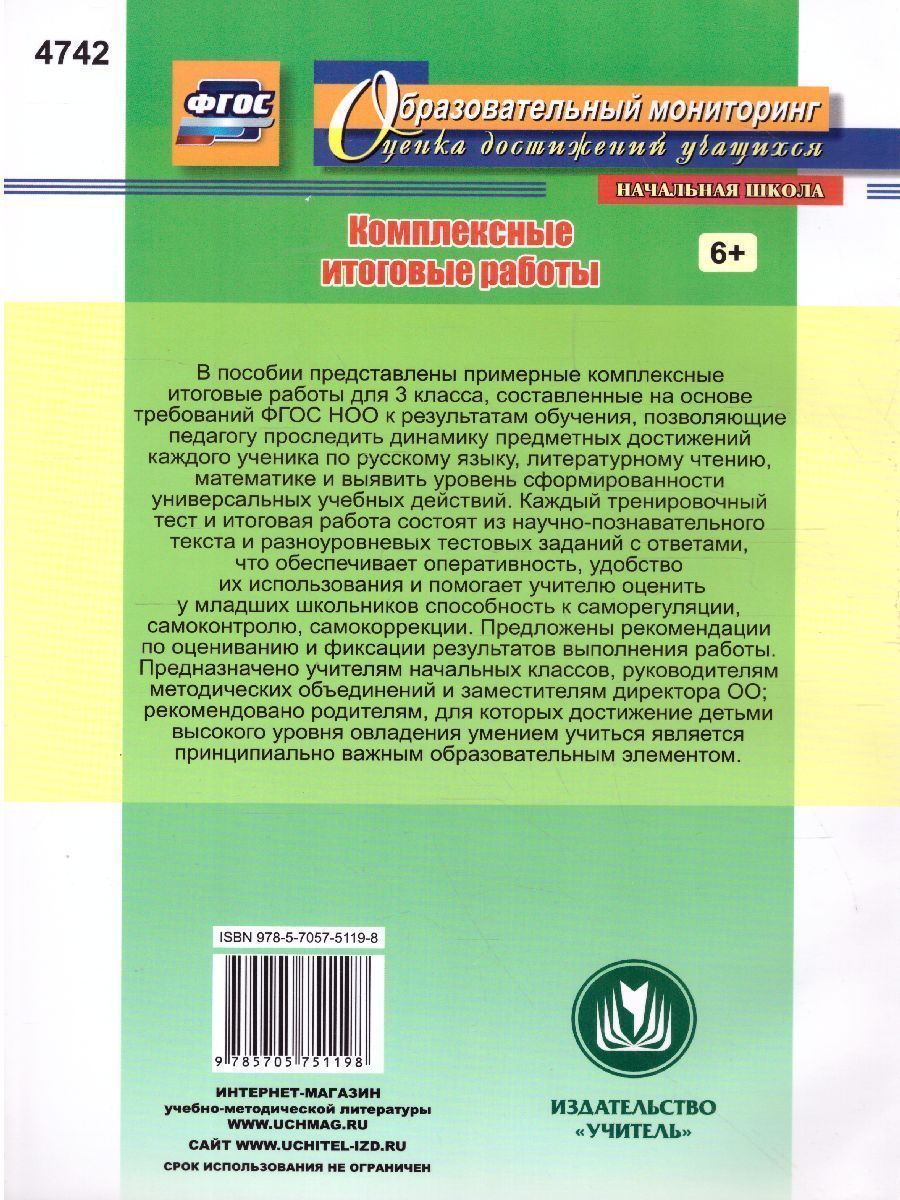 В пособии представлены примерные комплексные итоговые работы для 3 класса, составленные на основе требований ФГОС НОО к результатам обучения, позволяющие педагогу проследить динамику предметных достижений каждого ученика по русскому языку, литературному чтению, математике и выявить уровень сформированности универсальных учебных действий. Каждый тренировочный тест и итоговая работа состоят из научно-познавательного текста и разноуровневых тестовых заданий с ответами, что обеспечивает оперативность, удобство их использования и помогает учителю оценить у младших школьников способность к саморегуляции, самоконтролю, самокоррекции. Предложены рекомендации по оцениванию и фиксации результатов выполнения работы. Предназначено учителям начальных классов, руководителям методических объединений и заместителям директора 00; рекомендовано родителям, для которых достижение детьми высокого уровня овладения умением учиться является принципиально важным образовательным элементом. 2-е издание.Характеристики