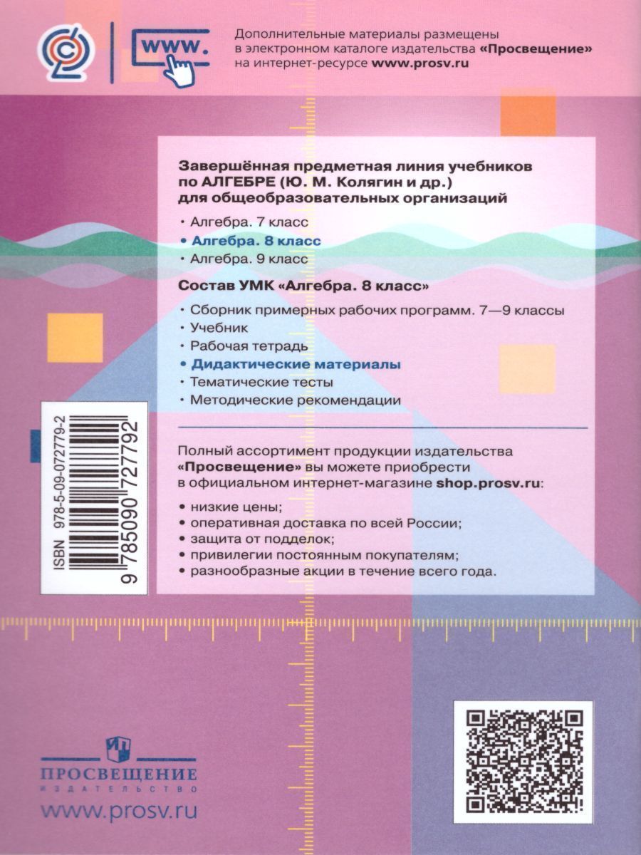 Данная книга предназначена для учителей, работающих по учебнику «Алгебра. 8 класс» авторов Ю. М. Колягина и др. Она содержит задания, дополняющие систему упражнений учебника, и позволяет организовать дифференцированную и индивидуальную работу учащихся на всех этапах урока. В главах пособия содержатся материалы к каждому параграфу учебника, а также контрольная или самостоятельная работа по теме. Все задания имеют балловую оценку уровня их сложности и ответы. Книга также используется в качестве дополнения к учебнику Ш. А. Алимова и др. «Алгебра. 8 класс».Характеристики