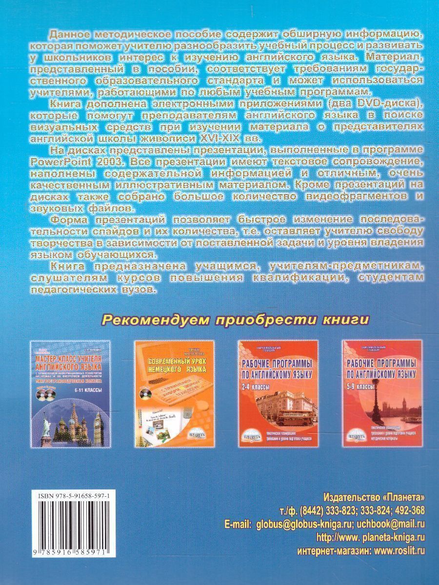 Данное методическое пособие содержит информацию, которая поможет учителю разнообразить учебный процесс и развивать у школьников интерес к изучению английского языка. Материал, представленный в пособии, соответствует требованиям государственного образовательного стандарта и может использоваться учителями, работающими по любым учебным программам. Книга дополнена электронными приложениями (два DVD-диска), которые помогут преподавателям английского языка в поиске визуальных средств, при изучении материала о представителях английской школы живописи XVI-XIX вв. На дисках представлены презентации, выполненные в программе PowerPoint 2003. Все презентации имеют текстовое сопровождение, и наполнены иллюстративным материалом отличного качества. Кроме презентаций на дисках также собрано большое количество видеофрагментов и звуковых файлов. Форма презентаций позволяет быстро изменять последовательность слайдов и их количество, т.е. оставляет учителю свободу творчества в зависимости от поставленной задачи и уровня владенияХарактеристики