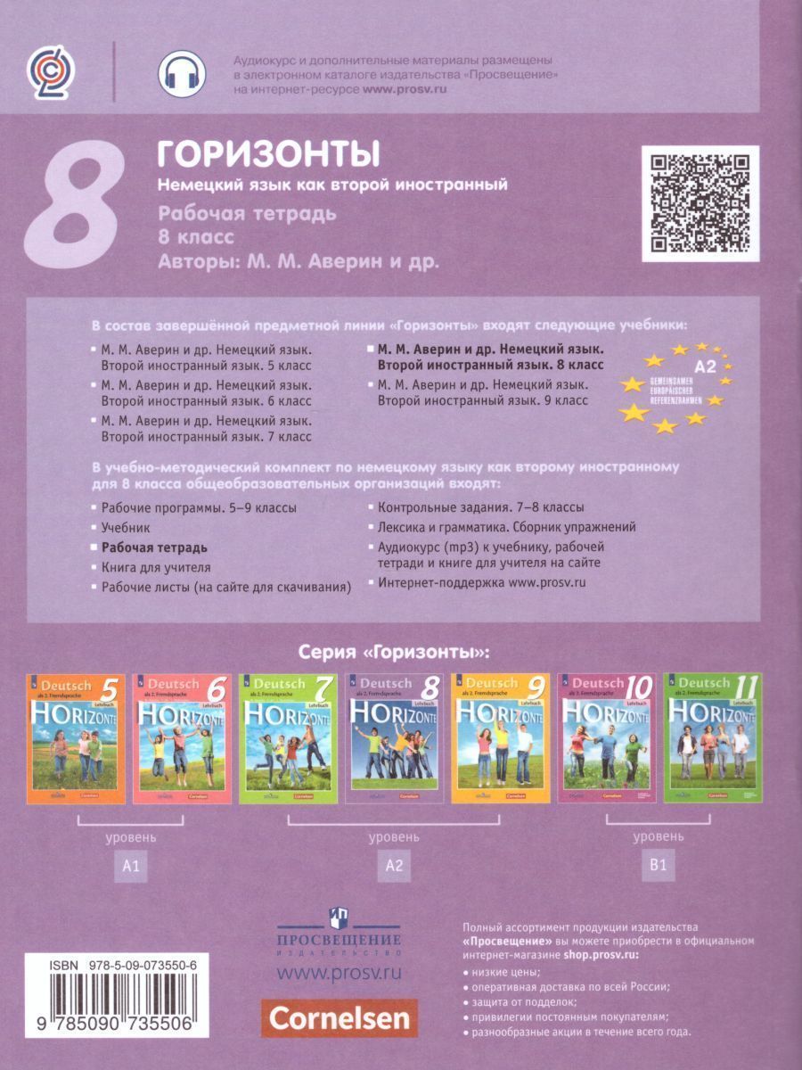 Пособие предназначено для учащихся общеобразовательных учреждений, продолжающих изучать немецкий язык как второй иностранный с 5 класса, ориентировано на требования Федерального государственного образовательного стандарта основного общего образования. В рабочей тетради представлены задания по активизации навыков письменной речи, аудирования с письменным контролем, чтения. Также в ней содержится раздел портфолио, дополнительные тренировочные задания и задания игровой направленности, содержащие ребусы, загадки, кроссворды. Задания рабочей тетради включаются в учебный процесс, запланированы для работы учащихся не только дома, но и в классе, являются логическим продолжением заданий учебника. В комплект входят: рабочая программа, учебник, рабочая тетрадь, книга для учителя, рабочие листы, контрольные задания для 7–8 классов, аудиокурс (mp3) к учебнику, рабочей тетради и книге для учителя, электронная форма учебника.Характеристики