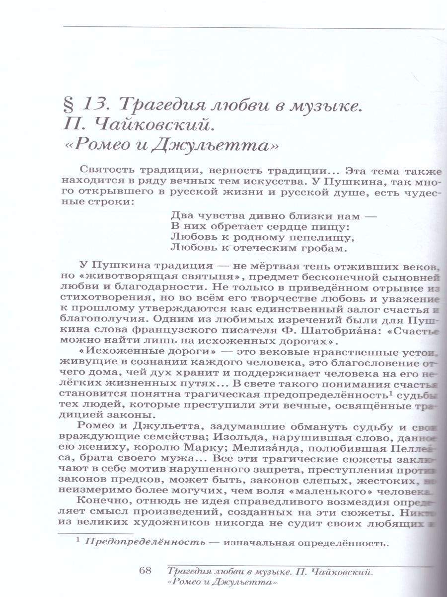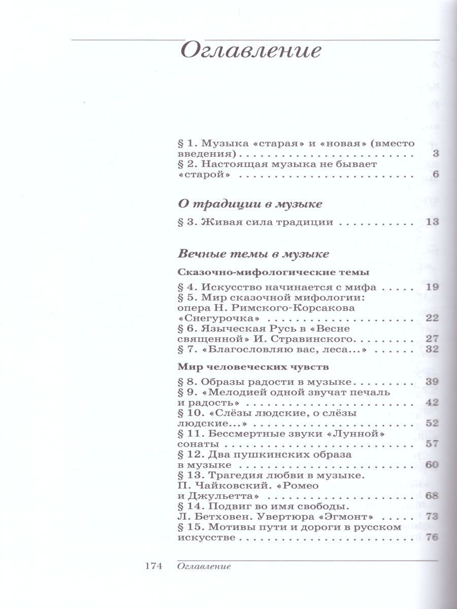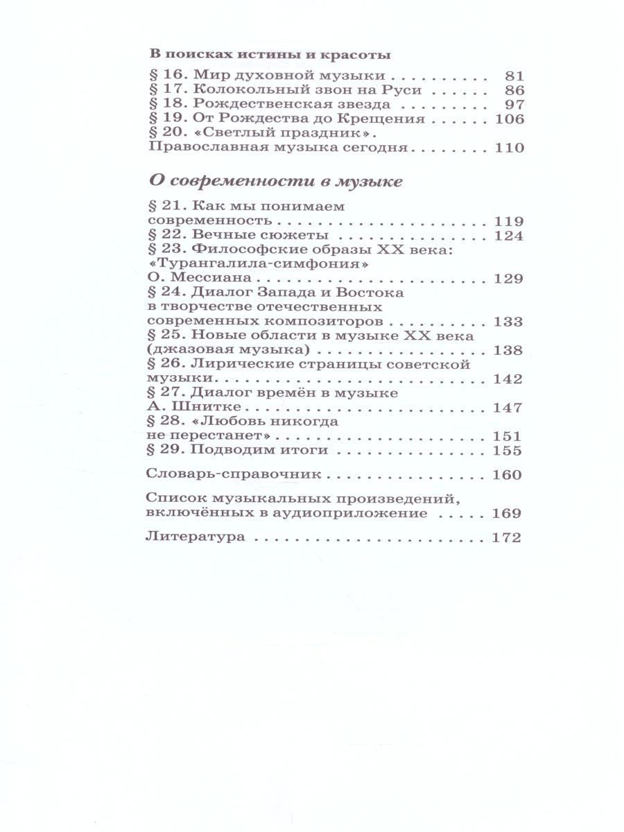Учебник соответствует Федеральному государственному образовательному стандарту основного общего образования.Главная тема учебника — "Традиция и современность в музыке" — раскрывается в трёх основных разделах: "О традиции в музыке", "Вечные темы в музыке" и "О современности в музыке".В комплексе с учебником издаются электронное приложение, аудиоприложение, рабочая тетрадь "Дневник музыкальных размышлений", нотное приложение и методическое пособие для учителя.Характеристики