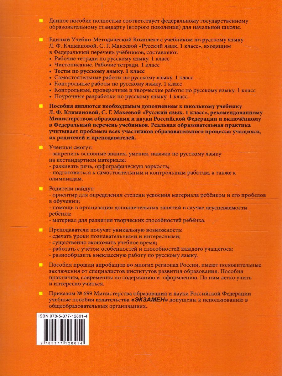 Данное пособие полностью соответствует федеральному государственному образовательному стандарту (второго поколения) для начальной школы. Данный сборник с тестами предназначен для тематического и итогового контроля знаний учащихся по основным разделам учебника "Русский язык" (авт. Л. Ф. Климанова, С. Г. Макеева). Он может быть использован учителями, работающими и по другим комплекта*, так как основные темы курсов совпадают. Тесты помогут учащимся в изучении основных тем курса русского языка, а учителю предоставят систематизированный проверочный материал. Приказом № 729 Министерства образования и науки Российской Федерации учебные пособия издательства "Экзамен" допущены к использованию в общеобразовательных учреждениях. 4-е издание, переработанное и дополненное.Характеристики