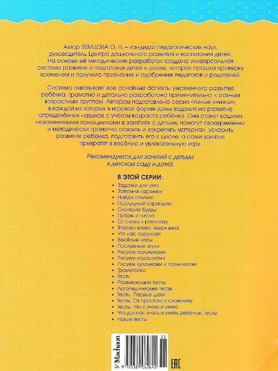 Автор Земцова О.Н. - кандидат педагогических наук, руководитель Центра дошкольного развития и воспитания детей. На основе ее методических разработок создана универсальная система развития и подготовки детей к школе, которая прошла проверку временем и получила признание и одобрение педагогов и родителей. Система охватывает все основные аспекты умственного развития ребенка, грамотно и детально разработана применительно к разным возрастным группам. Автором подготовлена серия "Умные книжки", в каждой из которых в игровой форме даны задания на развитие определенных навыков с учетом возраста ребенка. Они станут вашими незаменимыми помощниками в занятиях с детьми, помогут своевременно и методически грамотно освоить и закрепить материал, ускорить развитие ребенка, подготовить его к школе, а сами занятия превратят в веселую и увлекательную игру.Характеристики