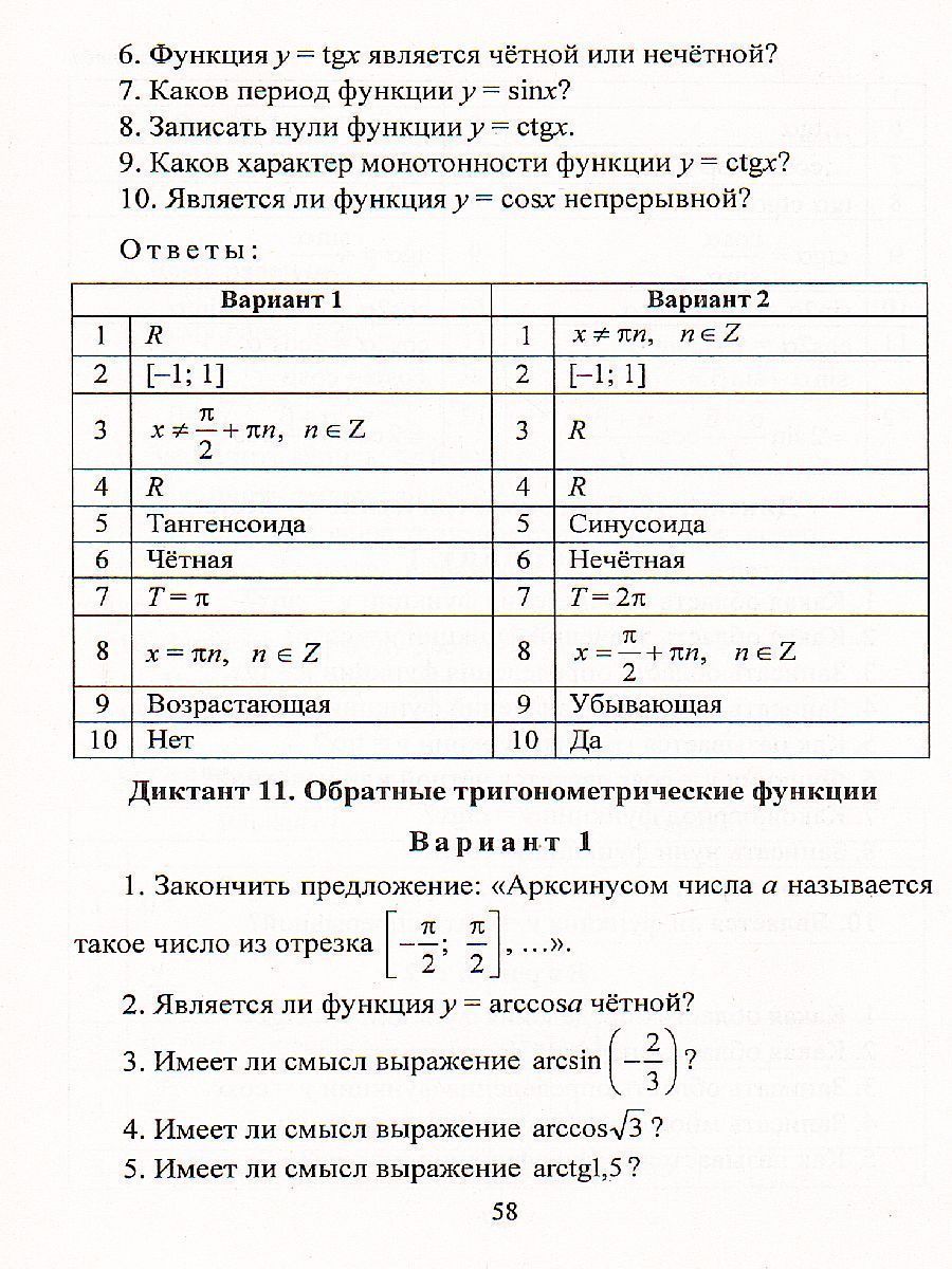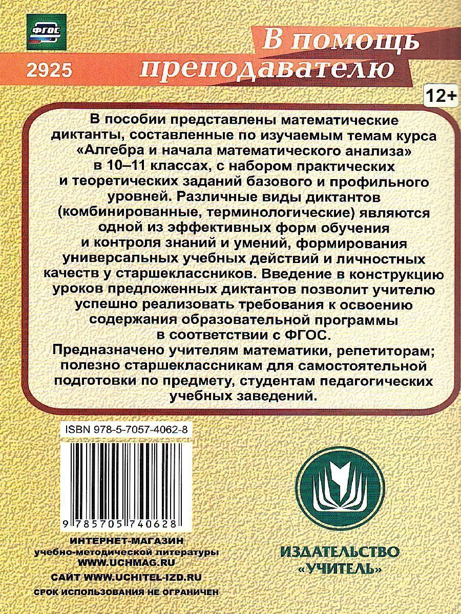 В пособии представлены математические диктанты, составленные по изучаемым темам курса "Алгебра и начала математического анализа" в 10-11 классах, с набором практических и теоретических заданий базового и профильного уровней. Различные виды диктантов (комбинированные, терминологические) являются одной из эффективных форм обучения и контроля знаний и умений, формирования универсальных учебных действий и личностных качеств у старшеклассников. Введение в конструкцию уроков предложенных диктантов позволит учителю успешно реализовать требования к освоению содержания образовательной программы в соответствии с ФГОС.Предназначено учителям математики, репетиторам; полезно старшеклассникам для самостоятельной подготовки по предмету, студентам педагогических учебных заведений.Характеристики