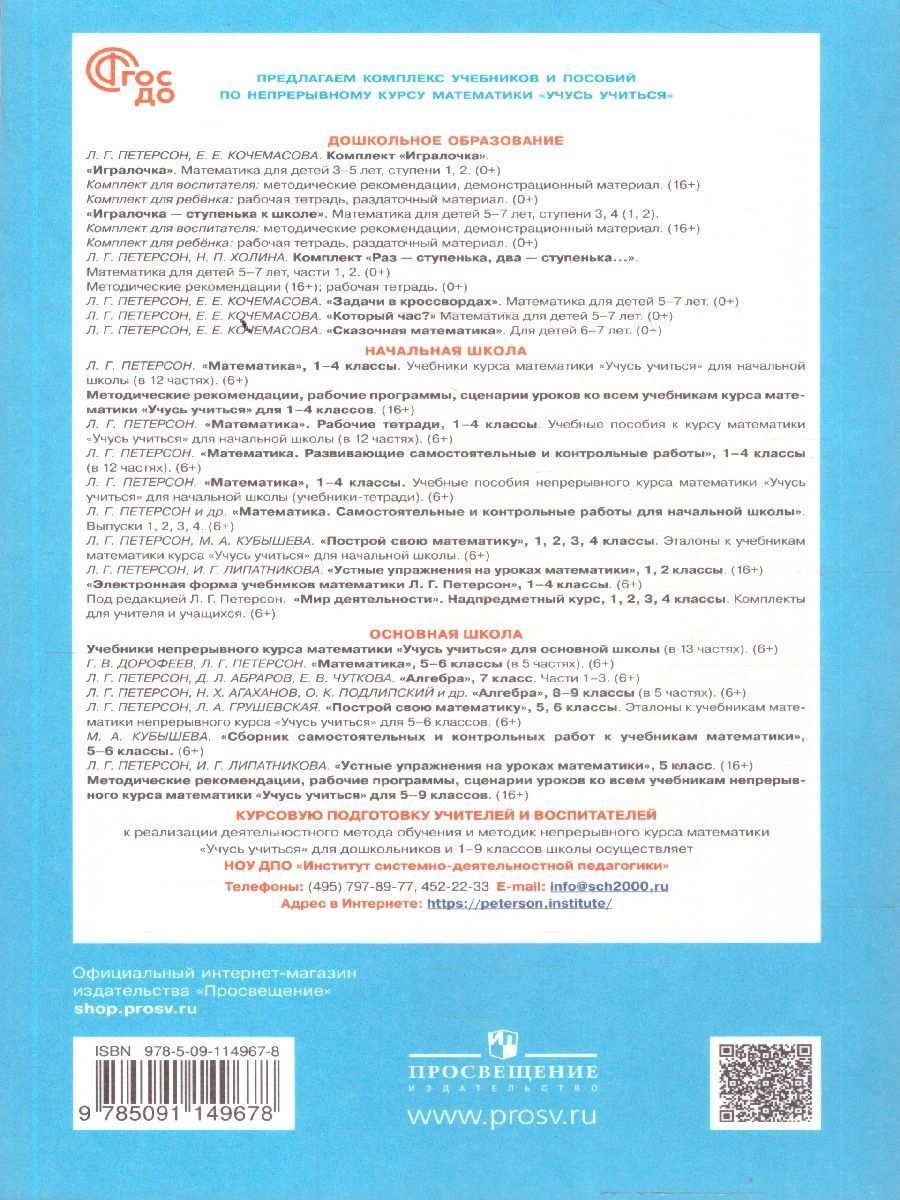 Методическое пособие «Игралочка — ступенька к школе», часть 3 предназначено для развития математических представлений детей 5-6 лет. Содержит описание концепции, программы и технологии проведения занятий с детьми на основе деятельностного метода Л.Г.Петерсон (технологии «Ситуация»).Является составной частью учебно-методического комплекта «Игралочка» для детей 3-7 лет. В комплект также входят рабочие тетради, программа, демонстрационные и раздаточные материалы к каждому занятию. Учебно-методический комплект «Игралочка» ориентирован на развитие у дошкольников мышления, творческих способностей, интереса к математике. Является начальным звеном непрерывного курса математики «Учусь учиться» от 3 до 15 лет. Его непосредственным продолжением служат учебники математики Л.Г.Петерсон для начальной и основной школы. Входит в комплексную программу дошкольного образования «Мир открытий». Может использоваться в качестве парциальной программы математического развития детей в дошкольных образовательных организациях всех типов и для индивидуальных занятий с детьми. Пособие адресовано специалистам по дошкольному образованию, студентам педагогических колледжей и вузов.Характеристики