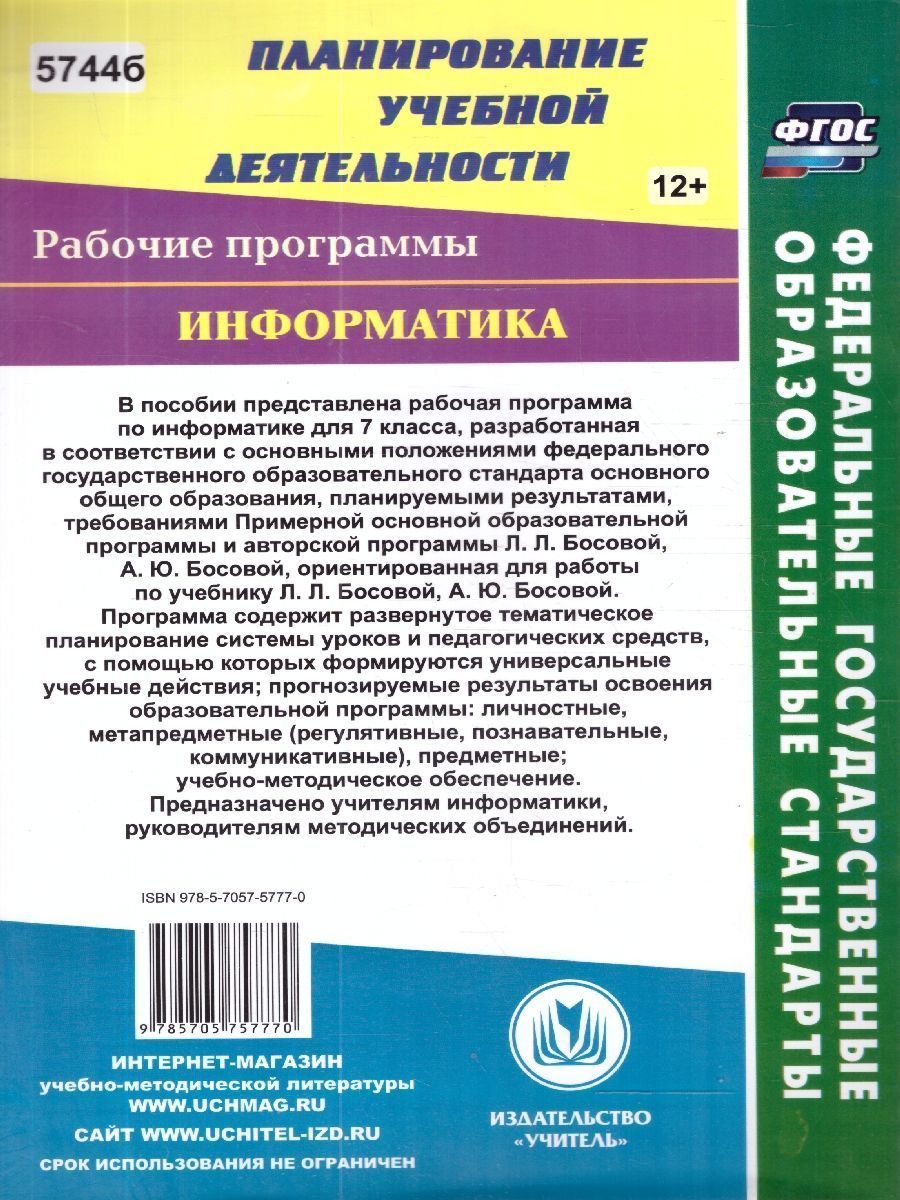 В пособии представлена рабочая программа по информатике для 7 класса, разработанная в соответствии с основными положениями федерального государственного образовательного стандарта основного общего образования, планируемыми результатами, требованиями Примерной основной образовательной программы и авторской программы Л. Л. Босовой, А. Ю. Босовой, ориентированная для работы по учебнику Л. Л. Босовой, А. Ю. Босовой (М.: БИНОМ. Лаборатория знаний, 2019). Программа содержит развернутое тематическое планирование системы уроков и педагогических средств, с помощью которых формируются универсальные учебные действия; прогнозируемые результаты освоения образовательной программы: личностные, метапредметные (регулятивные, познавательные, коммуникативные), предметные; учебно-методическое обеспечение. Предназначено учителям информатики, руководителям методических объединений. 2-е, переработанное.Характеристики