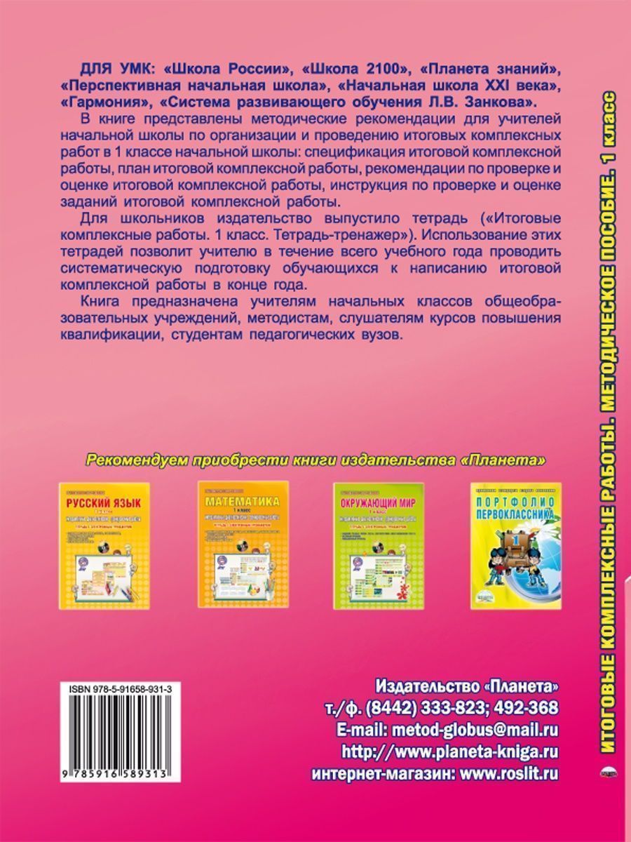 ДЛЯ УМК: «Школа России», «Школа 2100», «Планета знаний», «Перспективная начальная школа», «Начальная школа XXI века», «Гармония», «Система развивающего обучения Л.В. Занкова». В книге представлены методические рекомендации для учителей начальной школы по организации и проведению итоговых комплексных работ в 1 классе начальной школы: спецификация комплексной работы, план комплексной работы, рекомендации по проверке и оценке комплексной работы, инструкция по проверке и оценке заданий комплексной работы. Для школьников издательство выпустило тетрадь («Итоговые комплексные работы. 1 класс»). Использование данных тетрадей позволит учителю в течение всего учебного года осуществлять систематическую работу по подготовке обучающихся к написанию итоговой комплексной работы в конце года. Книга предназначена учителям начальных классов общеобразовательных учреждений, методистам, слушателям курсов повышения квалификации, студентам педагогических вузов.Характеристики
