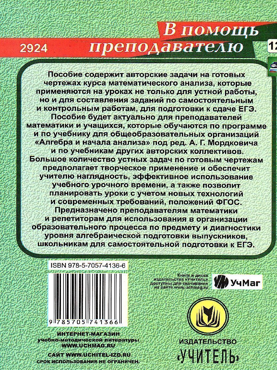 Пособие содержит авторские задачи на готовых чертежах курса математического анализа, которые применяются на уроках не только для устной работы, но и для составления заданий по самостоятельным и контрольным работам, для подготовки к сдаче ЕГЭ. Пособие будет актуально для преподавателей математики и учащихся, которые обучаются по программе и по учебнику для общеобразовательных организаций "Алгебра и начала анализа" под ред. А. Г. Мордковича и по учебникам других авторских коллективов. Большое количество устных задач по готовым чертежам предполагает творческое применение и обеспечит учителю наглядность, эффективное использование учебного урочного времени, а также позволит планировать уроки с учетом новых технологий и современных требований, положений ФГОС.Предназначено преподавателям математики и репетиторам для использования в организации образовательного процесса по предмету и диагностики уровня алгебраической подготовки выпускников, школьникам для самостоятельной подготовки к ЕГЭ.Характеристики