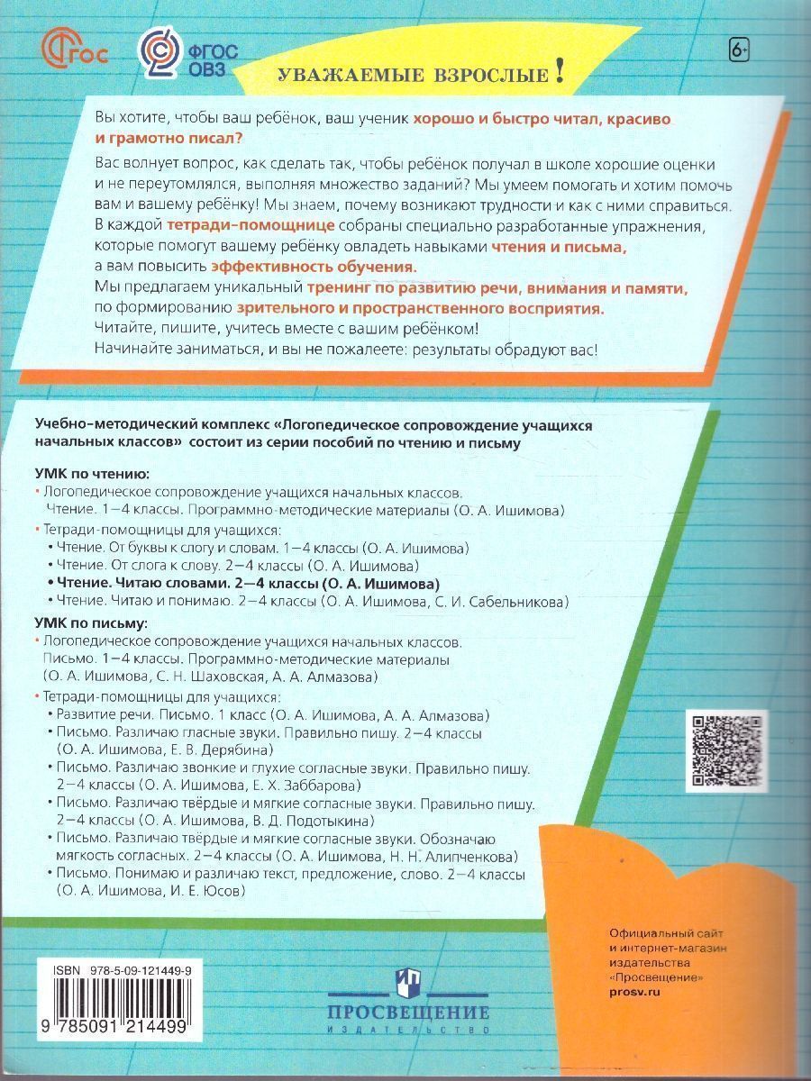Тетрадь-помощница «Чтение. Читаю словами» предназначена для занятий с учащимися 2–4 классов, имеющими трудности в овладении навыком чтения (медленно читающие дети). Задания пособия направлены на овладение продуктивными способами чтения вслух (чтение словами и группами слов) и подготавливают детей к чтению про себя. Структура пособия состоит из 18 занятий, в которых используются специально разработанные упражнения и задания. Подготовительные упражнения способствуют формированию зрительно-пространственных, зрительно-двигательных, речедвигательных и речеслуховых представлений. Лексический материал для заданий отобран с учётом частотности и постепенного усложнения слоговой структуры слов, вариативности типов слогов в составе слова. Тетрадь-помощница входит в учебно-методический комплекс «Логопедическое сопровождение учащихся начальных классов», способствующий освоению обучающимися основной образовательной программы начального общего образования. Данное издание «Чтение. Читаю словами» продолжает серию пособий для развития технической стороны чтения. Тетрадь-помощницу можно использовать в урочной или внеурочной деятельности, в сопровождающей её коррекционно-педагогической работе, при оказании помощи детям со стороны родителей.Характеристики