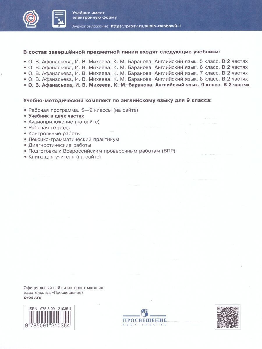 Учебники, созданные известными специалистами в области преподавания английского языка, является основным компонентом учебно-методического комплекса для 9 класса. Учебники соответствуют Федеральному государственному образовательному стандарту основного общего образования, рекомендован Министерством образования и науки Российской Федерации.Характеристики