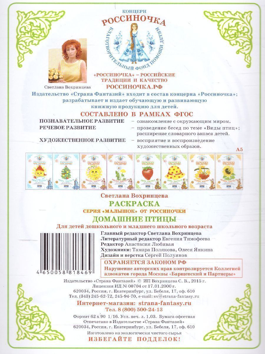 Книжка-раскраска (формата А5) содержит яркие предметные картинки на тему «Домашние птицы» и стихи для малышей. Контуры картинок для раскрашивания чёткие, тщательно прорисованные. Предназначена для: ознакомления с окружающим миром; развития умений и навыков детей в работе с гуашевыми красками и карандашами.Характеристики