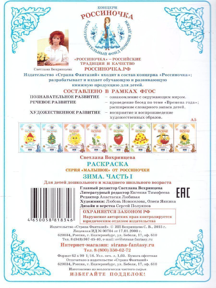 Книжка-раскраска (формата А5) содержит яркие предметные картинки на тему «Зима. Часть I» и стихи для малышей. Контуры картинок для раскрашивания чёткие, тщательно прорисованные. Предназначена для: ознакомления с окружающим миром; развития умений и навыков детей в работе с гуашевыми красками и карандашами.Характеристики