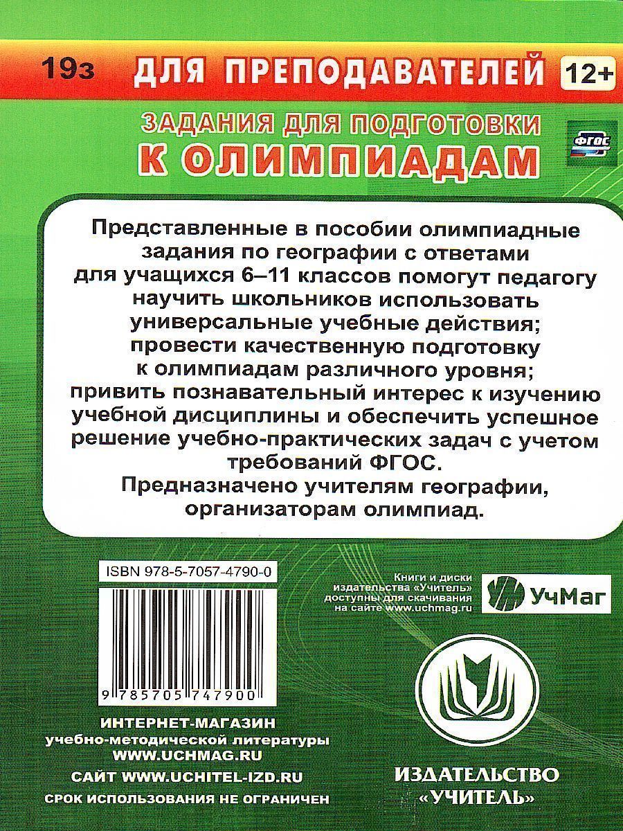 Представленные в пособии олимпиадные задания по географии с ответами для учащихся 6-11 классов помогут педагогу научить школьников использовать универсальные учебные действия; провести качественную подготовку к олимпиадам различного уровня; привить познавательный интерес к изучению учебной дисциплины и обеспечить успешное решение учебно-практических задач с учетом ФГОС. Предназначено учителям географии, организаторам олимпиад.Характеристики