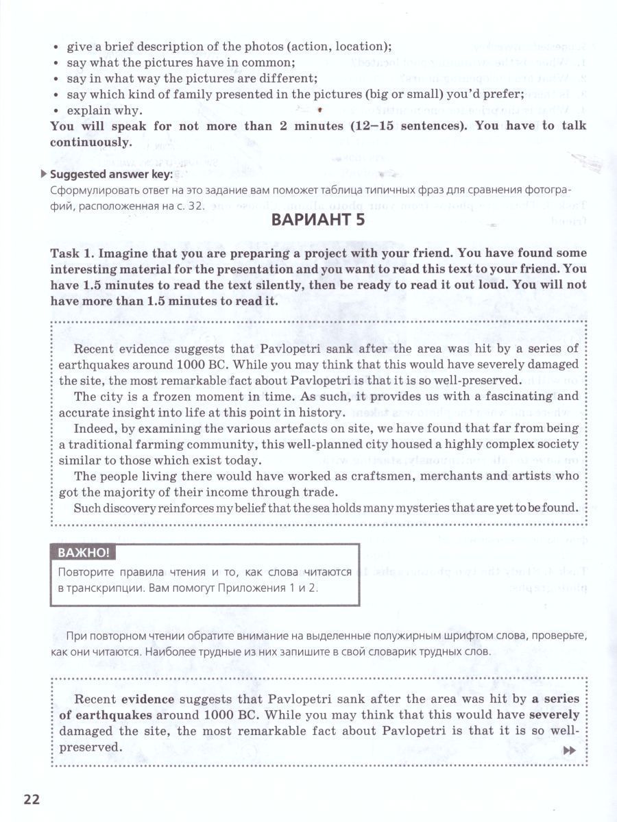 Серия «Готовимся к экзамену» Пособие содержит 5 вариантов для подготовки к устной части ЕГЭ, первый из которых подробно разбирается и комментируется автором. В первой части пособия учащиеся смогут получить советы и пошаговые инструкции по подготовке к каждому из четырёх заданий экзамена, а также разобраться с критериями оценки ответов. Во второй части пособия представлен полезный справочный материал. В новом, переработанном пособии учтены последние изменения в третьем задании устной части ЕГЭ-2016 по английскому языку. Кроме того, для данного пособия совместно с международной компанией ABBYY разработана электронная программа-тренажёр, которая позволит учащимся ознакомиться с технической стороной экзамена: записать собственный вариант ответа, прослушать свою запись, а также ознакомиться с образцами правильных ответов, начитанных дикторами. Тренажёр можно будет бесплатно скачать и установить при помощи индивидуального кода доступа, который указан на карточке внутри пособия.Характеристики
