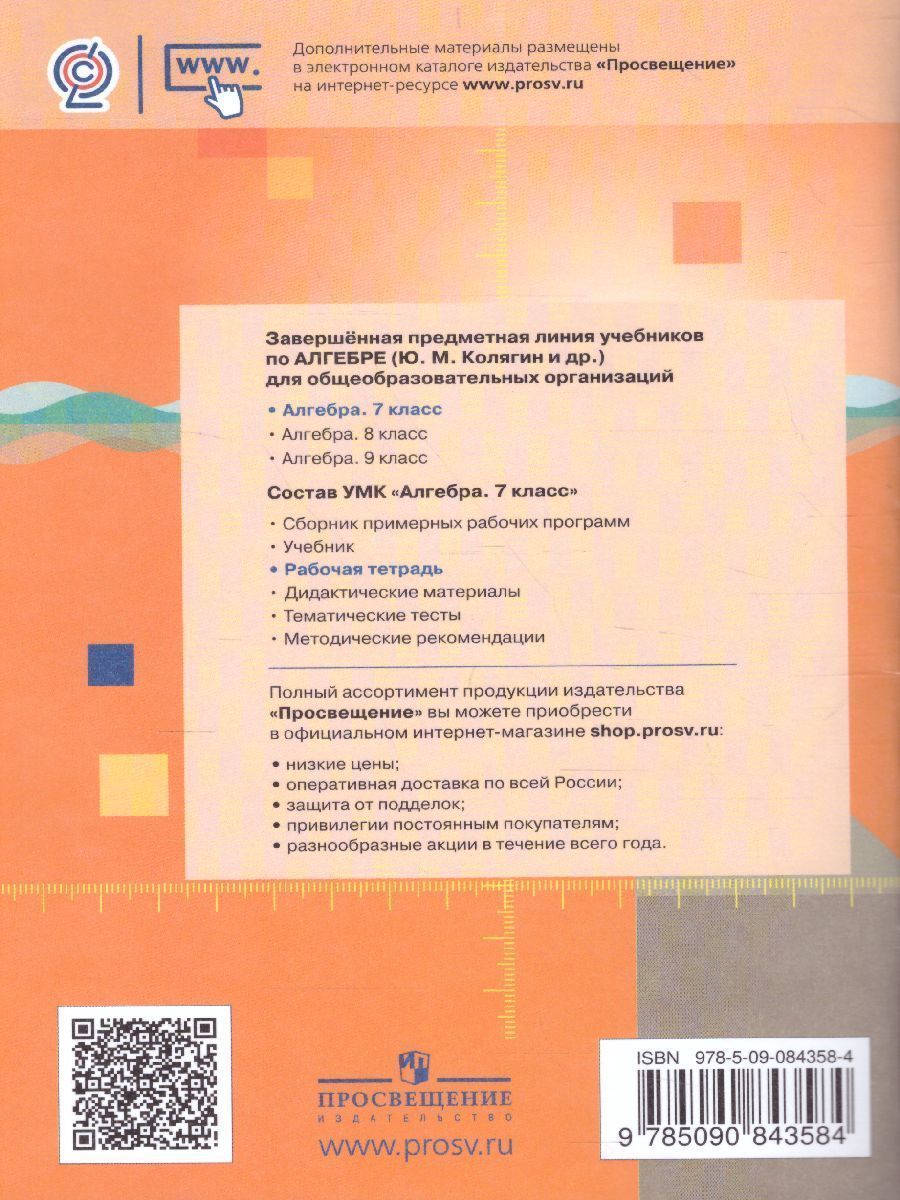 Рабочая тетрадь написана в соответствии с концепцией обучения алгебре по учебникам «Алгебра. 7 класс» авторов Ю. М. Колягина и др., а также авторов Ш. А. Алимова и др. Упражнения тетради разделены на три раздела. Первый содержит упражнения для подготовки учащихся к изучению нового материала, второй содержит упражнения дополнительные к упражнениям учебника, третий – упражнения для проверки уровня усвоения материала.Характеристики