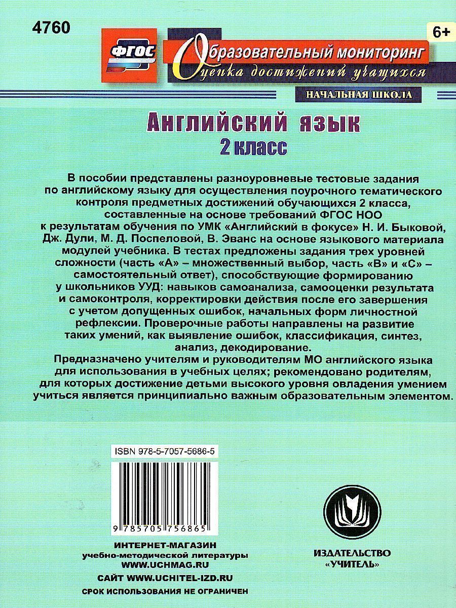 В пособии представлены разноуровневые тестовые задания по английскому языку для осуществления поурочного тематического контроля предметных до-стижений обучающихся 2 класса, составленные в соответствии с требованиями ФГОС НОО к результатам обучения по УМК "Английский в фокусе" Н. И. Бы-ковой, Дж. Дули, М. Д. Поспеловой, В. Эванс на основе языкового материала модулей учебника. В тестах предложены задания трех уровней сложности (часть "А" - множественный выбор, части "В" и "С" - самостоятельный ответ), способствующие формированию у школьников УУД: навыков самоанализа, са-мооценки результата и самоконтроля, корректировки действия после его завер-шения с учетом допущенных ошибок, начальных форм личностной рефлексии. Проверочные работы направлены на развитие таких умений, как выявление ошибок, классификация, синтез, анализ, декодирование. Предназначено учителям и руководителям методических объединений ан-глийского языка, заместителям директора ОО; рекомендовано родителям, для которых достижение детьми высокого уровня овладения умением учиться явля-ется принципиально важным образовательным элементом.Характеристики