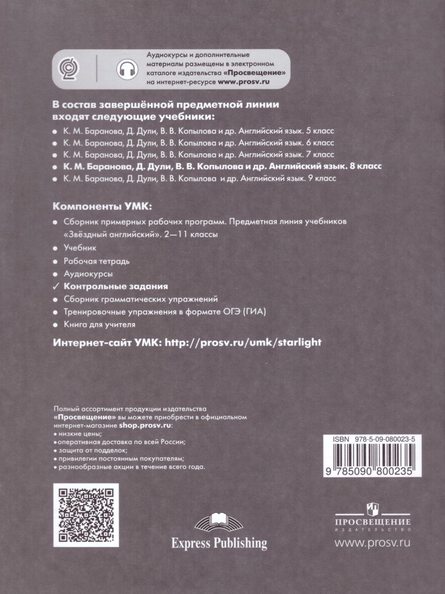 Сборник контрольных заданий является обязательным компонентом УМК серии «Звёздный английский» для учащихся 8 класса общеобразовательных организаций и школ с углублённым изучением английского языка. Он включает контрольные работы, которые выполняются учащимися по завершении работы над каждым модулем учебника в качестве итогового контроля. Сборник также содержит ключи к контрольным работам и аудиоскрипты. Аудиокурс к контрольным заданиям можно скачать бесплатно с сайтаХарактеристики