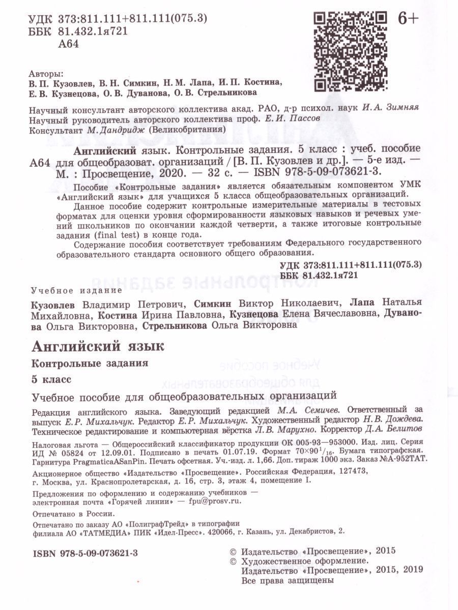 Пособие «Контрольные задания» является обязательным компонентом УМК «Английский язык» для учащихся 5 класса общеобразовательных организаций. Данное пособие содержит контрольные измерительные материалы в тестовых форматах для оценки уровня сформированности языковых навыков и речевых умений школьников по окончании каждой четверти, а также итоговые контрольные задания (final test) в конце года. Содержание пособия соответствует требованиям Федерального государственного образовательного стандарта основного общего образования.Характеристики