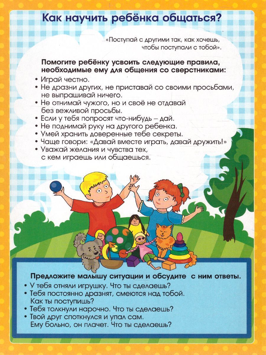 Взаимодействие с семьtй - актуальное направление ФГОС ДО. Ширма из 6 красочных страниц для информационного просвещения родителей содержит ответы на вопросы: - Нужно ли учить ребенка общаться? - Как изменяется характер общения дошкольников в зависимости от их возраста? - В каком возрасте начинаются первые ссоры малышей? - С чего начинается дружба? Адресовано воспитателям, педагогам-психологам, родителям.Характеристики