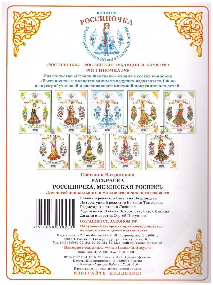Раскраска содержит яркие образы девочки Россиночки в красивых нарядах с элементами мезенской росписи. Контуры картинок для раскрашивания чёткие, тщательно прорисованные. Предназначена для: ознакомления детей с разнообразными элементами мезенской росписи и её характерными особенностями.Характеристики