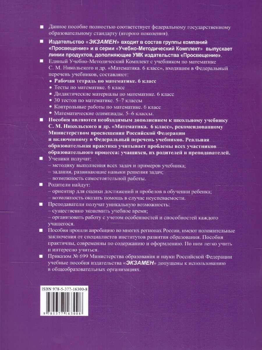 Данное пособие полностью соответствует федеральному государственному образовательному стандарту (второго поколения). Рабочая тетрадь является необходимым дополнением к школьному учебнику С. М. Никольского и др. "Математика. 6 класс" (издательство "Просвещение"), рекомендованному Министерством просвещения Российской Федерации и включенному в Федеральный перечень учебников. Автором предложены разнообразные упражнения по всем темам, изложенным в учебнике, в том числе: задания для закрепления изученного материала, задачи повышенной сложности, занимательные и развивающие задачи. В тетради имеются образцы для выполнения заданий. Нумерация и названия пунктов рабочей тетради соответствуют нумерации и названиям пунктов учебника. Тетрадь предназначена для работы с учащимия общеобразовательных организаций. Приказом № 699 Министерства образования и науки Российской Федерации учебные пособия издательства "Экзамен" допущены к использованию в общеобразовательных организациях.Характеристики