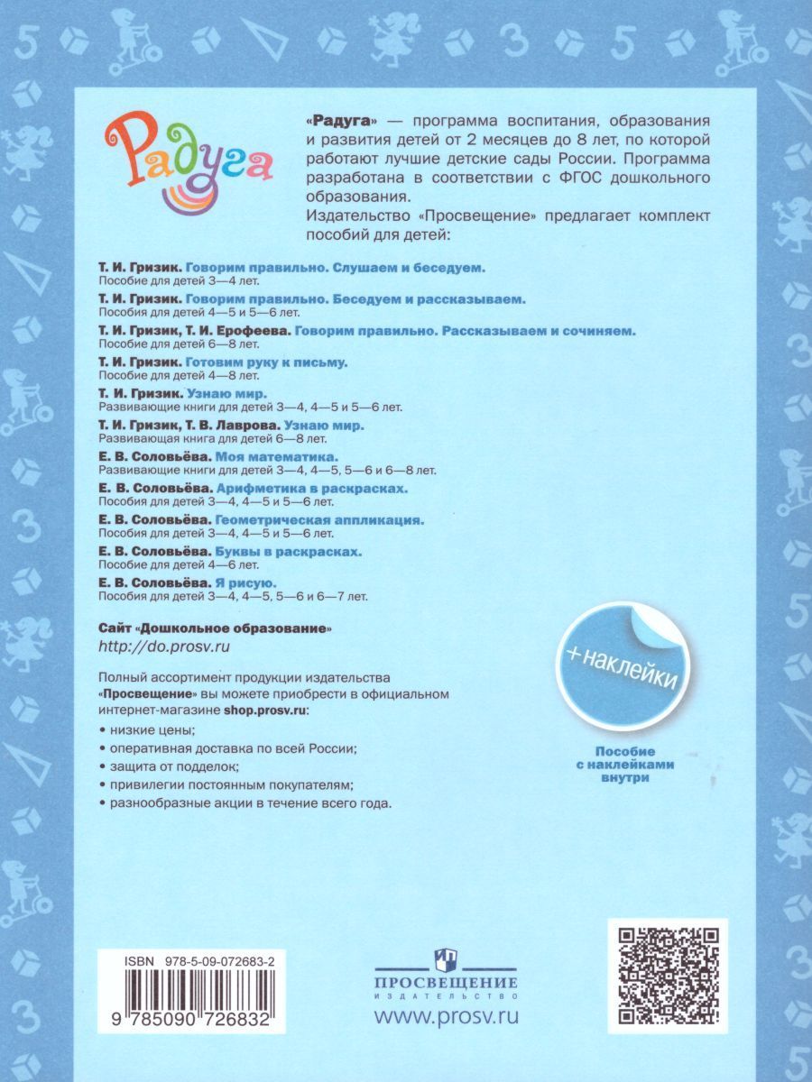 Книга соответствует положениям комплексной программы воспитания, образования и развития детей 2–8 лет в условиях детского сада. «Радуга» и предназначена для использования на занятиях по формированию элементарных математических представлений у детей 6–8 лет. Она может быть использована и родителями для занятий с детьми в семье. Пособие позволит закрепить у ребёнка представления о цифрах и геометрических фигурах, навыки счёта, умение решать арифметические задачи на сложение и вычитание и проводить классификацию. Для удобства работы издание выходит с наклейками.Характеристики