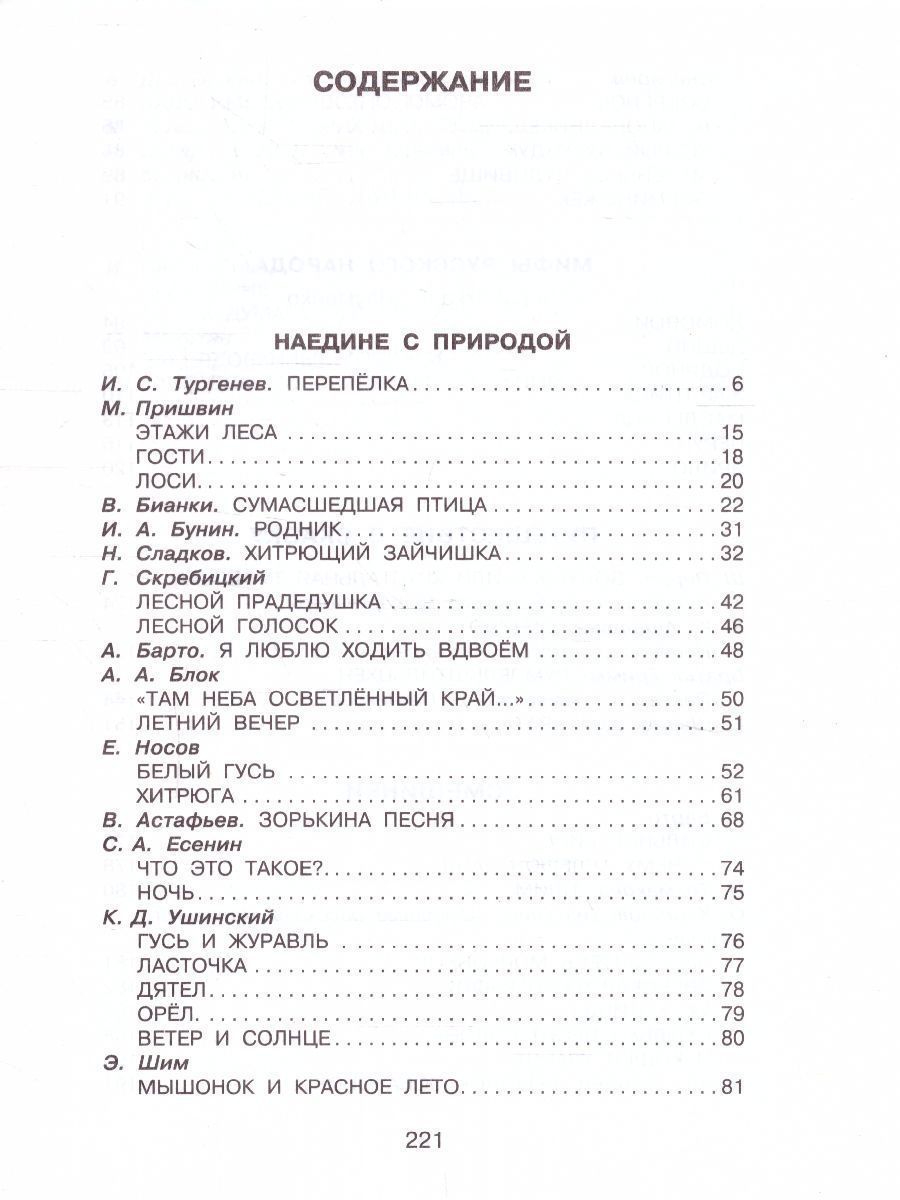 В сборник включены стихи, рассказы, сказки, рекомендованные для внеклассного чтения в 4 классе, а также для чтения в кругу семьи. Они вводят школьников в мир большой литературы, помогают формировать умения и навыки чтения, тяги к нему, развитию интересов и кругозора, нравственных качеств. В сборнике четыре раздела: "Наедине с природой", "Мифы русского народа", "Путешествие в сказку", "Смешинки". Среди авторов как классики русской литературы И.Тургенев, И.Бунин, А.Блок, С.Есенин, так и современные писатели и поэты.Характеристики