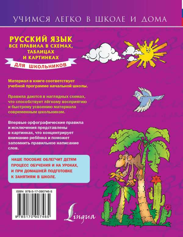 В книгу включены правила русского языка в соответствии с учебной программой 1–4 классов. Впервые правила даются в наглядных схемах, что способствует легкому восприятию и быстрому усвоению материала современным школьником. Впервые орфографические правила и исключения представлены в картинках, что концентрирует внимание ребенка и поможет запомнить правильное написание слов. В конце книги дается список словарных слов. Издание предназначается для учащихся начальных классов, будет интересно учителям русского языка и родителям.Характеристики
