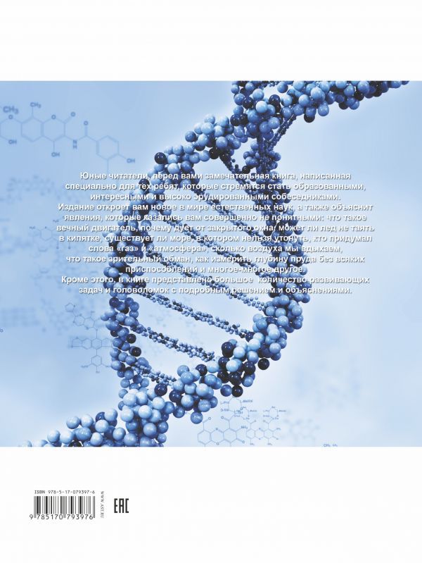Юные читатели, перед вами замечательная книга, написанная специально для тех ребят, которые стремятся стать образованными, интересными и высоко эрудированными собеседниками. Издание откроет вам новое в мире естественных наук, а также объяснит явления, которые казались вам совершенно не понятными: что такое вечный двигатель, почему дует от закрытого окна, может ли лед не таять в кипятке, существует ли море, в котором нельзя утонуть, кто придумал слова "газ" и "атмосфера", сколько воздуха мы вдыхаем, что такое зрительный обман, как измерить глубину пруда без всяких приспособлений и многое-многое другое. Кроме этого, в книге представлено большое количество развивающих задач и головоломок с подробным решением и объяснениями. Это прекрасно иллюстрированное издание станет отличным подарком для любознательных читателей.Характеристики