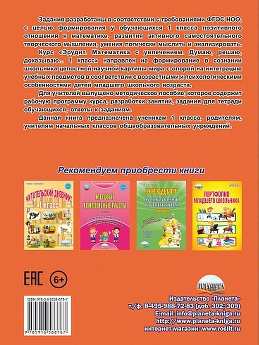 Задания в тетради разработаны с целью формирования у обучающихся 1 класса позитивного отношения к математике, развития активного самостоятельного творческого мышления, умения логически мыслить и анализировать. Курс «Эрудит. Математика с увлечением. Думаю, решаю, доказываю... 1 класс» направлен на формирование в сознании школьника целостной научной картины мира с опорой на интеграцию учебных предметов в соответствии с возрастными и психологическими особенностями детей младшего школьного возраста. Для учителей тетрадь дополнена методическим пособием, которое содержит рабочую программу курса, разработки занятий, задания для тетради обучающихся, ответы к заданиям. Тетрадь предназначена ученикам 1 класса, родителям, учителям начальных классов общеобразовательных учреждений.Характеристики