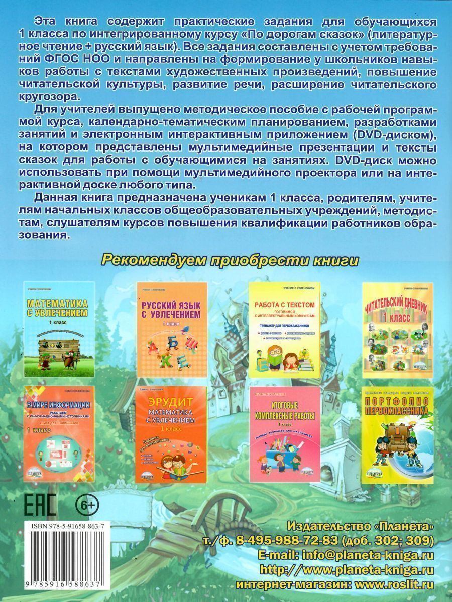 Эта книга содержит практические задания для обучающихся 1 класса по интегрированному курсу «По дорогам сказок» (литературное чтение + русский язык). Все задания составлены с учетом требований ФГОС НОО и направлены на формирование у школьников навыков работы с текстами художественных произведений, повышение читательской культуры, развитие речи, расширение читательского кругозора. Для учителей выпущено методическое пособие с рабочей программой курса, календарно-тематическим планированием, разработками занятий и электронным интерактивным приложением (DVD-диском), на котором представлены мультимедийные презентации и тексты сказок для работы с обучающимися на занятиях. DVD-диск можно использовать при помощи мультимедийного проектора или на интерактивной доске любого типа. Данная книга предназначена ученикам 1 класса, родителям, учителям начальных классов общеобразовательных учреждений, методистам, слушателям курсов повышения квалификации работников образования.Характеристики