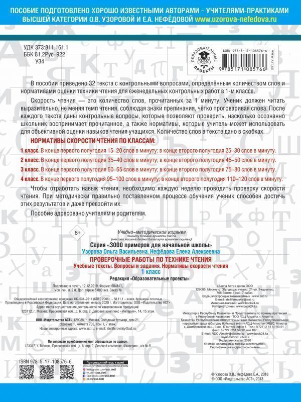 Проверочные работы по технике чтения 1 класс. Учебные тексты, вопросы и задания, нормативы скорости чтения. В пособии приведено 32 текста с контрольными вопросами, определенным количеством слов и нормативами оценки техники чтения для еженедельных и контрольных работ в 1 классе. Скорость чтения - это количество слов, прочитанных за 1 минуту. Ученик должен читать выразительно, не меняя темп чтения, соблюдая знаки препинания, четко проговаривая слова. После каждого текста даны контрольные вопросы, которые позволяют проверить, насколько осознанно школьник воспринимает прочитанное, а также нормативы, которые учитель может использовать для объективной оценки навыков чтения учащихся. Количество слов в текстах дано в скобках. Нормативы скорости чтения по классам: 1 класс. В конце первого полугодия 15-20 слов в минуту. В конце второго полугодия 25-30 слов в минуту. 2 класс. В конце первого полугодия 35-40 слов в минуту. В конце второго полугодия 45-50 слов в минуту. 3 класс. В конце первого полугодия 60-65 слов в минуту. В конце второго полугодия 75-80 слов в минуту. 4 класс. В конце первого полугодия 95-100 слов в минуту. В конце второго полугодия 110-120 слов в минуту. Чтобы отработать навык чтения, необходимо каждую неделю проводить проверку скорости чтения. При методически правильно поставленном процессе обучения ученик способен достичь этих результатов и даже превзойти их. Пособие адресовано учителям и родителям.Характеристики