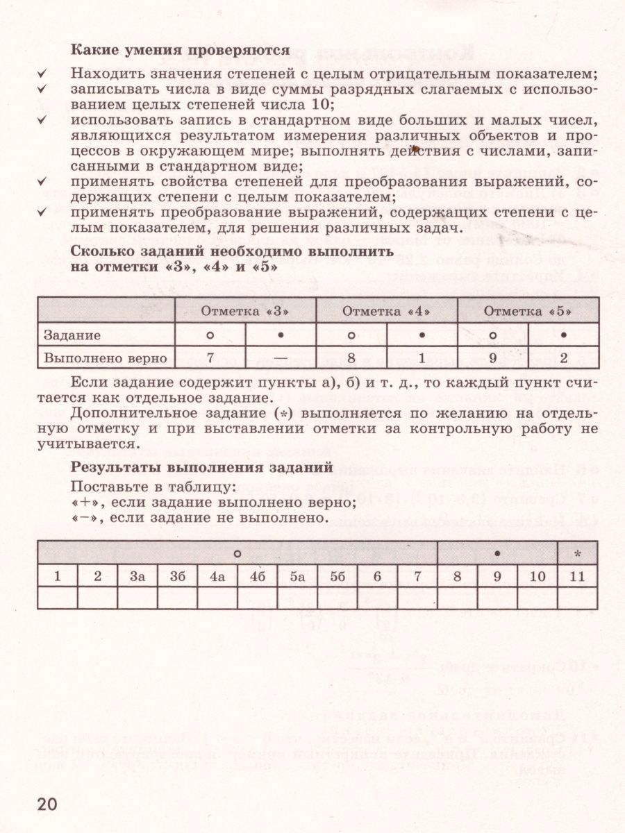 Учебное пособие содержит контрольные работы по курсу алгебры 8 класса, ориентированному на учебник Г. В. Дорофеева и др. Каждая работа состоит из заданий трёх уровней, обозначенных специальными значками, помогающими понять предъявляемые требования к уХарактеристики